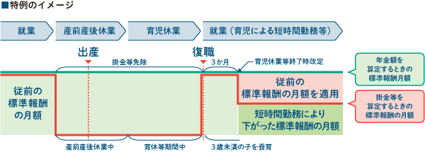 | 産前産後休業終了日にその産前産後に係る子を養育する場合、組合に申出をしたときは、産前産後休業終了日の翌日が属する月以後3か月に受けた報酬の平均額を基に標準報酬を改定します。産前産後休業終了時改定により算定された標準報酬の月額は、次の定時決定又は随時改定まで適用されます。ただし、産前産後休業終了日の翌日に育児休業等を開始している場合は対象外となります。 | ||